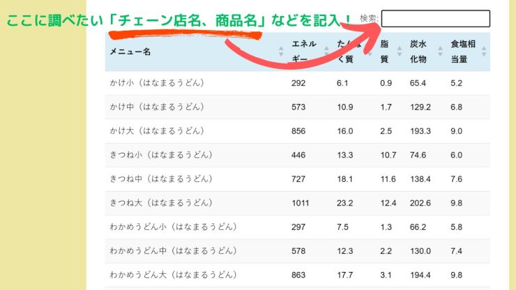 例:)きつねうどんが食べたい。チェーン店ごとに栄養成分情報を比較したいな。 - 行きたいチェーン店がある。